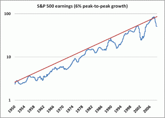 Bisogna qui intendersi. Gli utili cui Hussman fa riferimento non sono né quelli attesi dagli analisti né quelli fatti segnare nell’ultimo anno (le misure che tutti di solito citano) ma quelli massimi del ciclo (i cosiddetti peak earnings, ossia i più elevati registrati, entro il termine temporale di riferimento, in un arco di quattro trimestri).