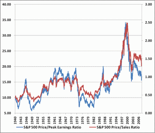 Fatte tutte queste premesse sul senso e l’utilità di impiegare un metro così ragionevole come il peak earnings P/E di Hussman, siamo ora pronti a vederlo in azione, nei due grafici seguenti. Il primo, tratto da una lettera del gennaio 2008, raffigura il peak earnings P/E (linea blu) dal 1940 alla fine del 2007 (nei dieci mesi successivi, qui non rappresentati, il P/E è crollato da 15 a 10)…