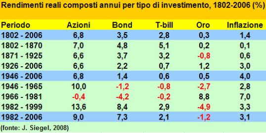 Dei rendimenti di lungo periodo di obbligazioni e azioni, in rapporto all’andamento dell’inflazione, ho già scritto nel post Rendimenti finanziari, le lezioni della storia. Lì pubblicavo la seguente tabella, compilata utilizzando i dati diffusi da Jeremy Siegel nell’ultima edizione del classico Stocks for the long run. Anche i dati di Siegel, com’è evidente, confermano la solidità delle analisi di Swensen.