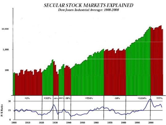 Il grafico rappresenta l’andamento storico dell’indice Dow Jones Industrial, anno per anno, dal 1900 alla fine del 2008. Balza subito agli occhi come la tendenza rialzista di lunghissimo periodo non sia stata costante. A periodi di rapida crescita si sono alternati periodi di stagnazione. I primi (in verde) sono i bull market secolari, i secondi (in rosso) i bear market secolari.